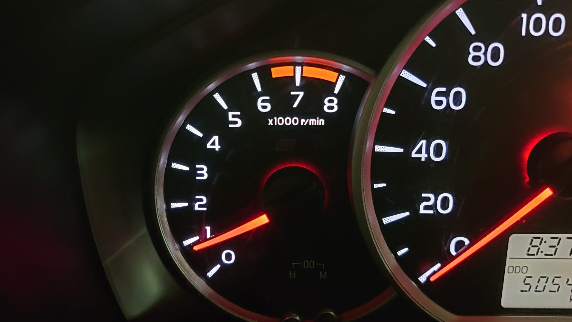 - タコメーター∶エンジンの回転数を表示する。1なら1分間あたり1,000回転、5なら1分間あたり5,000回転、ガソリン車やディーゼル車の場合はもっとも加速を得意とする回転域がある。モーターは特性上エンジンとは異なり、アクセルペダルを踏みこんだ瞬間に100%の回転(約10,000回転)を発生させるため電気自動車やハイブリッド車ではタコメーター自体が省かれることもある。