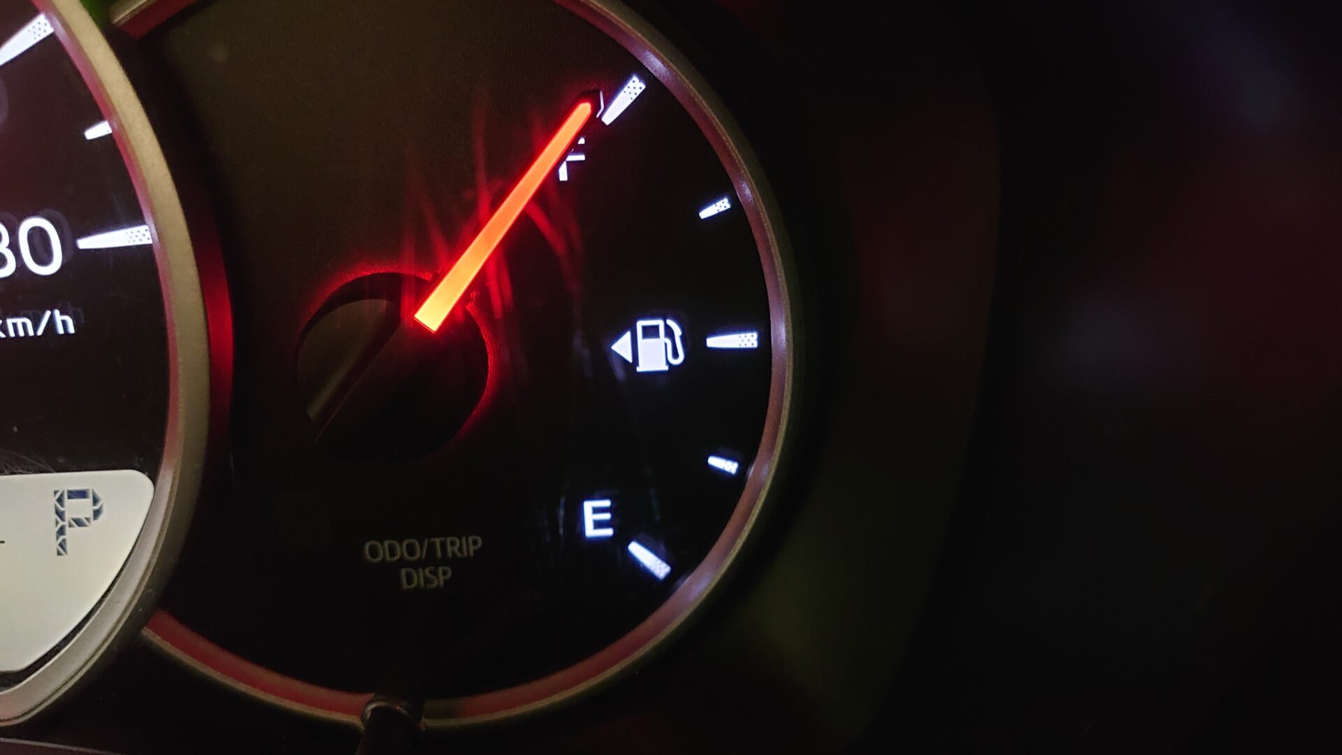 ガソリンメーターの拡大。画面中央のガソリンスタンドマークの横にある三角は給油口の向き。この車の場合は左に三角が向いているため車体の左側に給油口があります。
