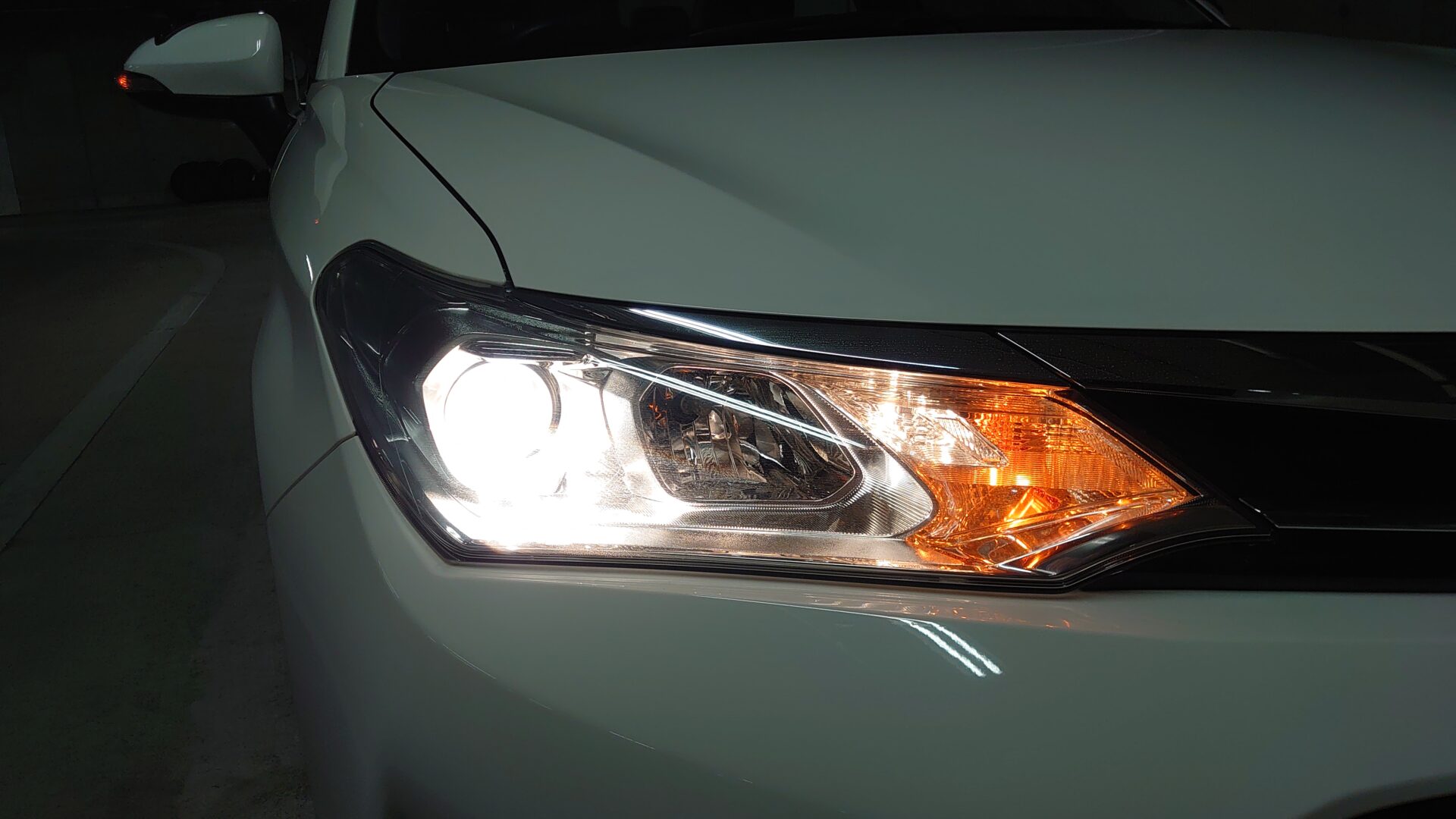 ロービーム点灯状態。ロービームでは40m先を照らすことができます。通称「下向き」。オートライト点灯時のデフォルトはロービームです。
