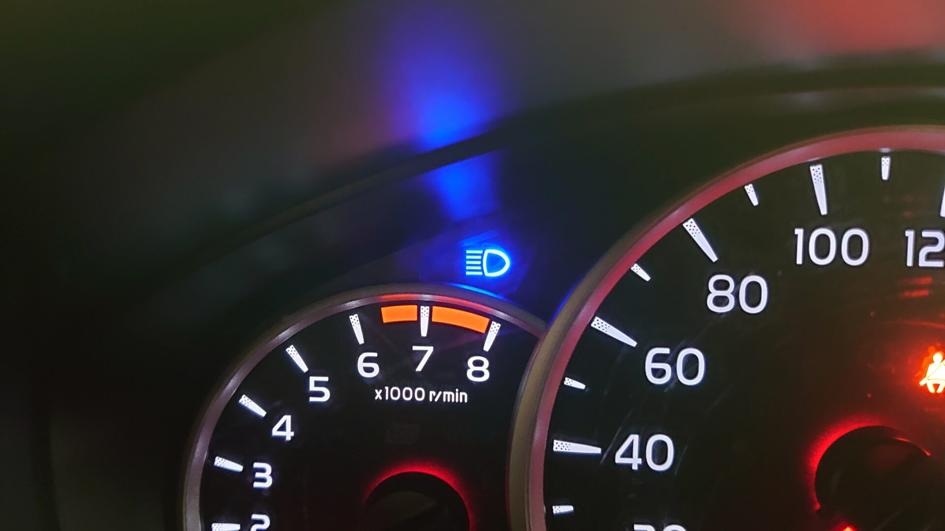 ハイビーム作動時はホイミスライムのような青色のマークが点灯します(画面中央)。