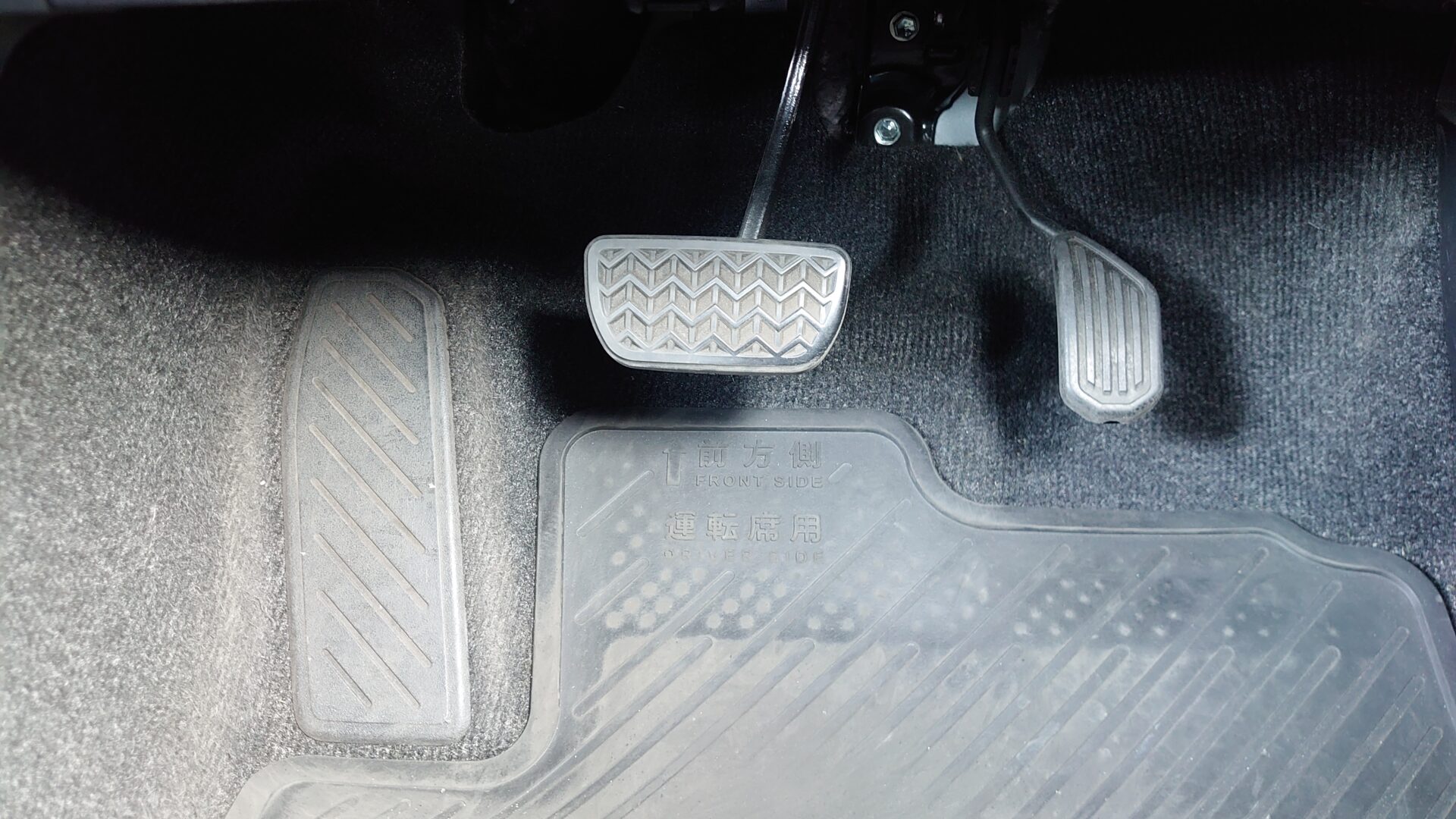 画面右側がアクセルペダル、画面中央がブレーキペダル、画面左側が左足を置くためのフットレストです。