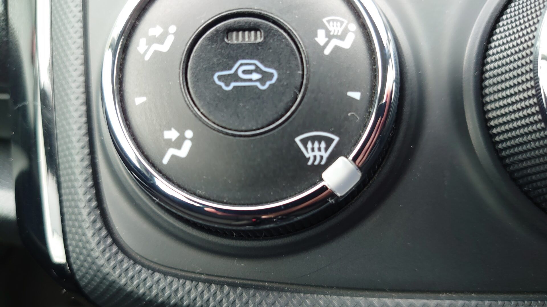 デフロスターのスイッチ(右下クラゲマーク)。作動時はA/CをONにします。画面中央の内気循環スイッチを押すことでフロントガラスの曇りを効率的に除去できます。