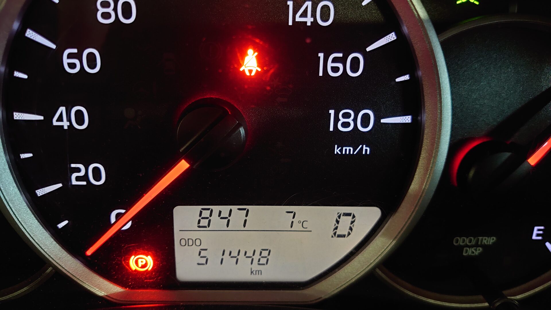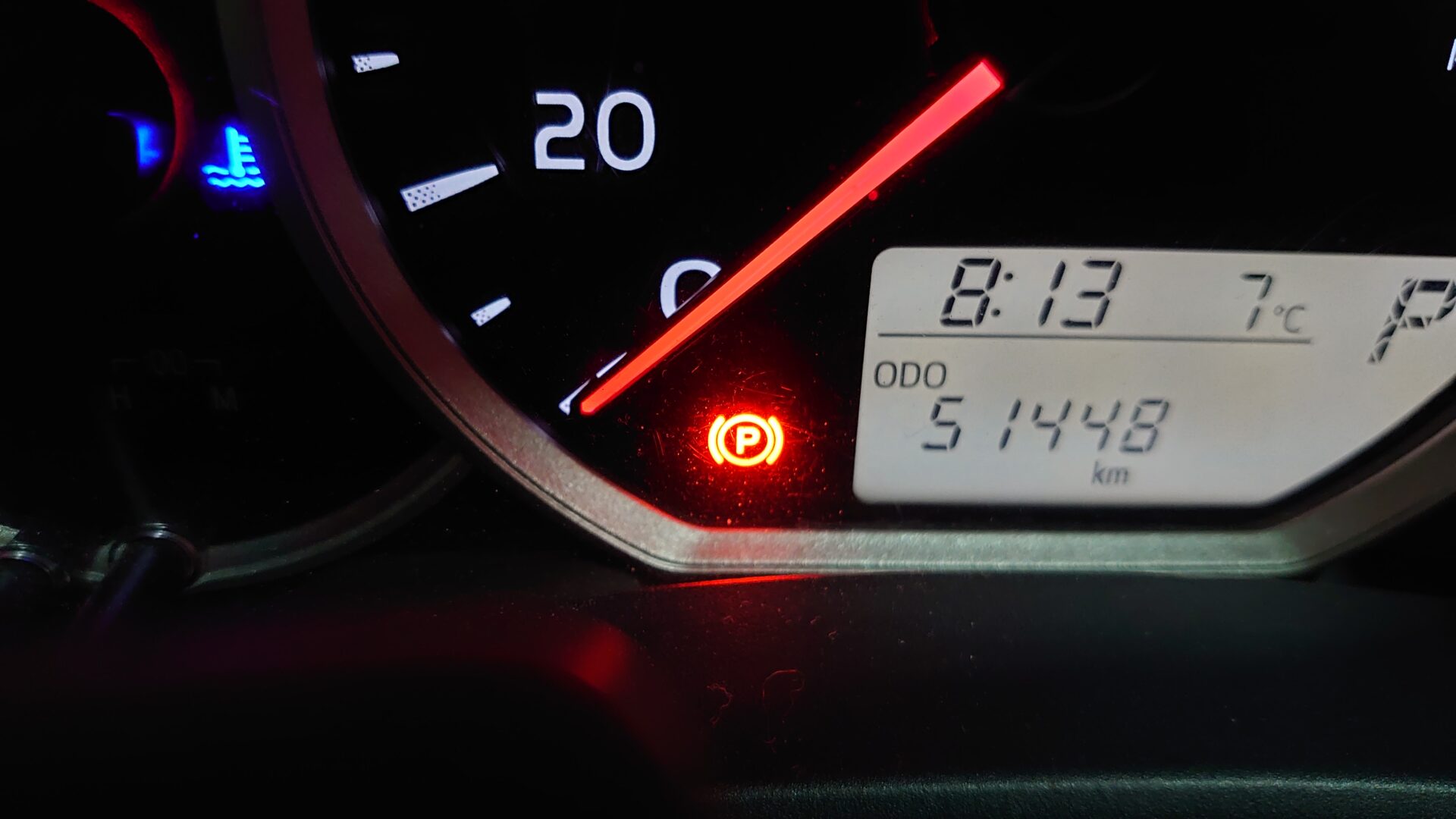 画面中央の「(P)」マークがパーキングブレーキ警告灯です。