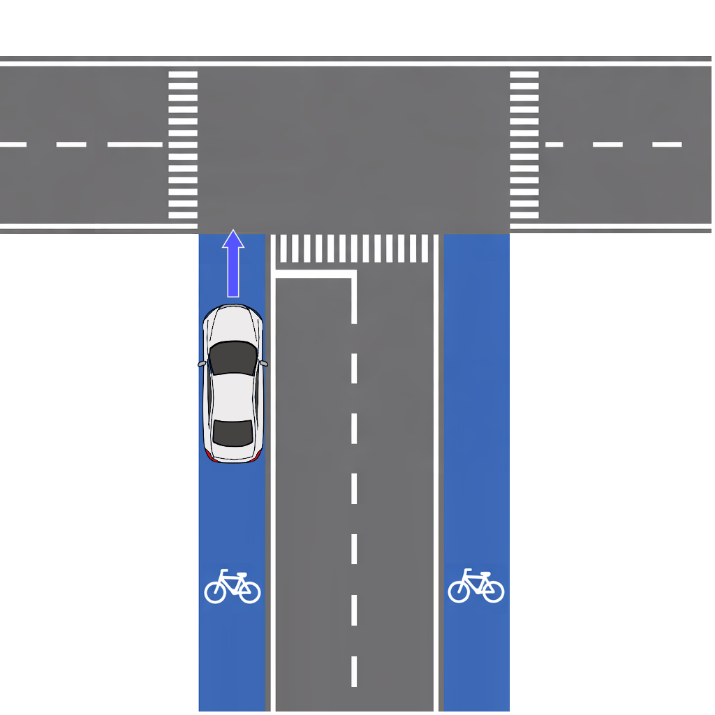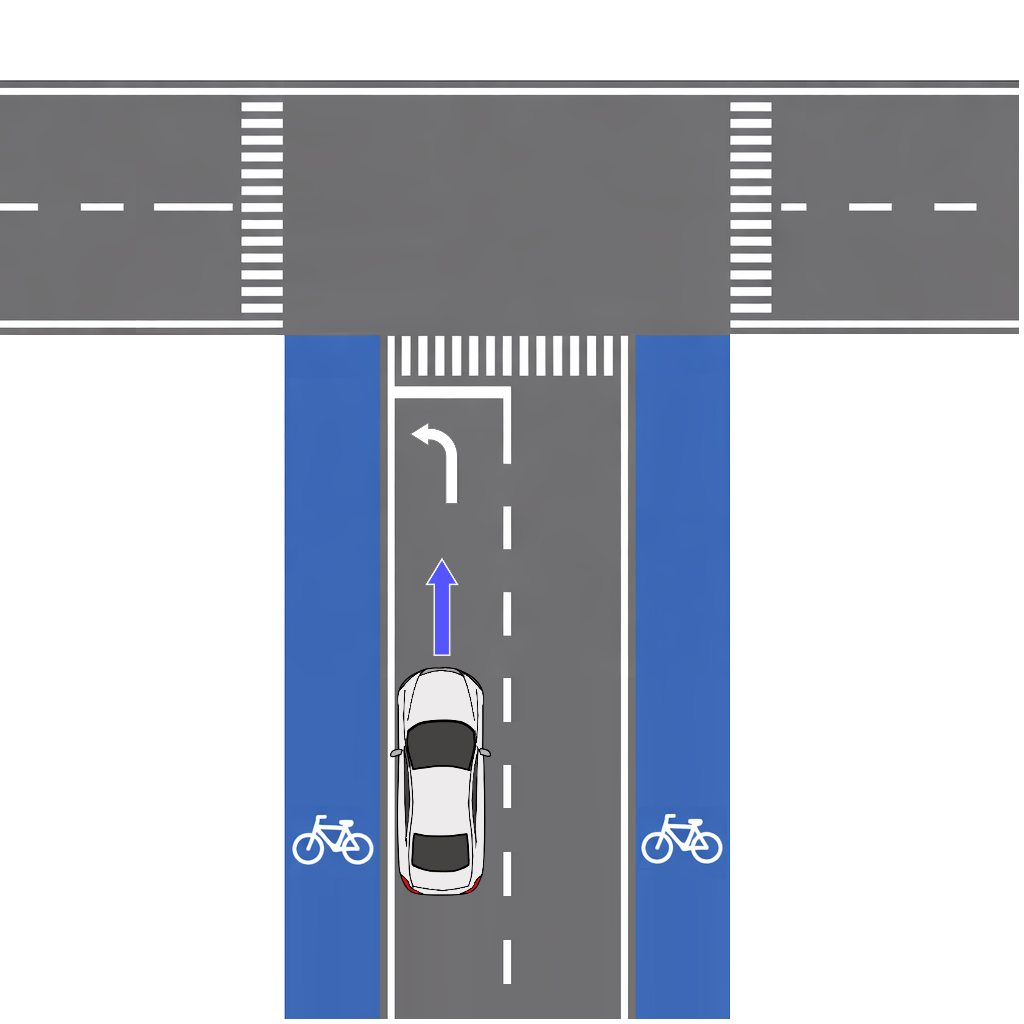 この場合は進行方向別区分がないため、バス専用通行帯と同様に歩道、縁石の側端に沿って通行します。できる限り自転車が入りこまないよう50cm以内を目安に寄せます。技能検定の採点基準では1m以内になっていますが、30cm〜50cm以内に寄せられないと自転車が割り込んでくる危険性があるため(道交法では自転車が入らないように寄せる必要があるので1mは矛盾)技術は必要です。